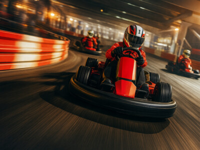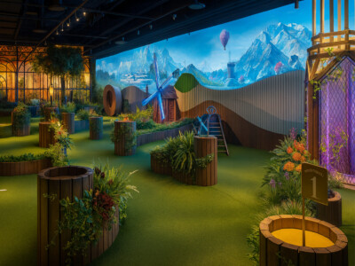 Immersive entertainment venues including mini-golf, indoor skydiving, an interactive baseball facility, go kart racing facility, and a vibrant surf park with dining.